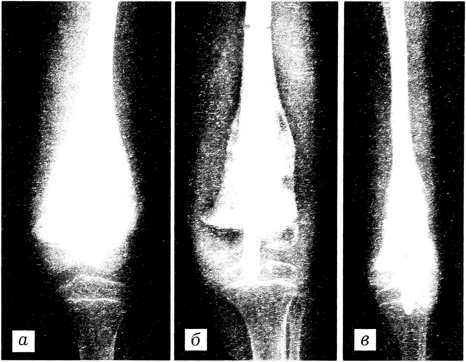 a — при поступлении; б — после резекции суставного конца бедренной кости и пересадки предварительно облученного реплантата с фиксацией металлическим штифтом; в — через 1,5 года после операции: сращение фрагментов кости, восстановление непрерывности кортикального слоя.