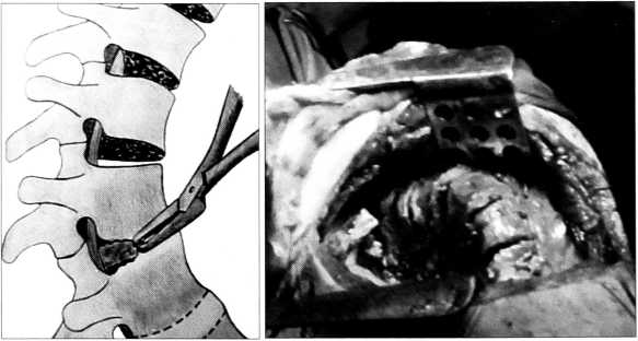 Отмечали диски, подлежащие удалению, рассекали над ними переднюю продольную связку, производили тотальную дискэктомию с удалением пульпозного ядра, фиброзного кольца и замыкательных пластинок, обязательно удаляли диски между телами позвонков на вогнутой стороне (рис. 1). Необходимо отметить, что у пациентов 15 лет и старше обнаруживался практически костный синостоз тел позвонков с вогнутой стороны. При рассечении дисков и синостоза на вогнутой стороне обязательно устанавливали шпатель за телами позвонков для исключения случайного повреждения аорты и вены. После этого убеждались в увеличении мобильности тел позвонков относительно друг друга.