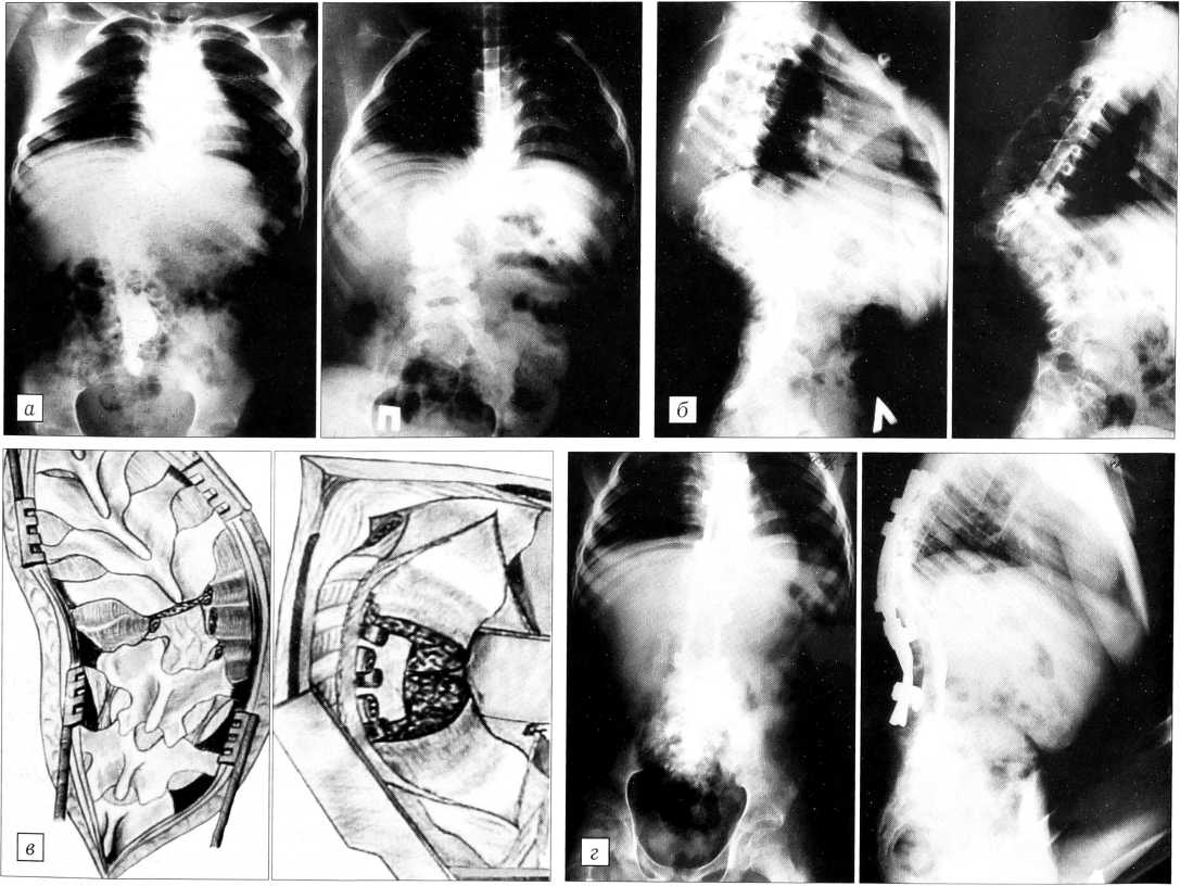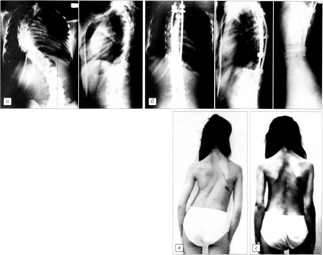 Рис. 2. Больная В. 21 года. а — рентгенограммы до операции: декомпенсированная деформация; б — после операции: коррекция общего угла 48° (50% от полной коррекции), декомпенсация устранена; в — внешний вид больной до операции, г — после операции.