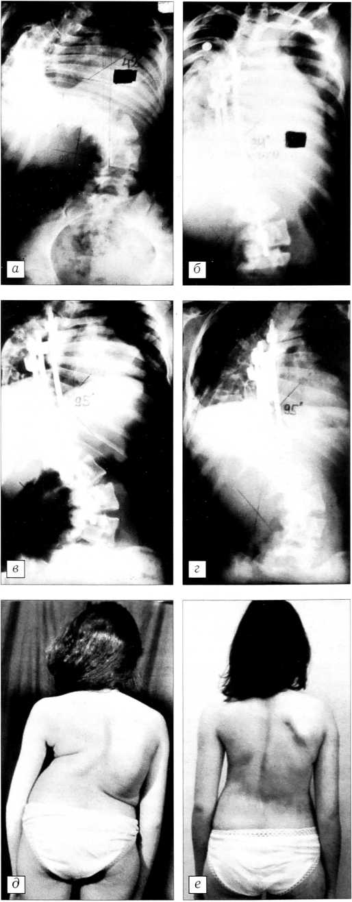 Рис. 4. Больная В. 16 лет. а — рентгенограмма до операции, б — после операции (дискэктомия с Т4 по Т11, коррекция деформации системой CD): коррекция общего угла 52° (38% от полной коррекции); в — рентгенограмма через 1 год, г — через 2 года после операции: потери коррекции общего угла нет, противодуги — 10°; д — внешний вид больной до операции, е — после операции.