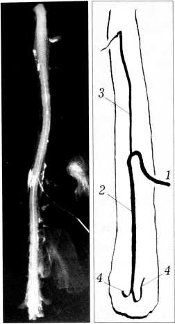 Описанные в литературе так называемые «островки» — участки раздвоения передней спинальной артерии на нашем материале встретились только в шейном отделе спинного мозга. В 3 случаях в системе нисходящей передней спинальной артерии в области конуса был обнаружен S-об- разный изгиб, от одной из вершин которого отходила тонкая, не более 100—150 мкм артерия, которая могла бы претендовать на определение дополнительной радикуломедуллярной, но ни в одном случае не было отмечено перекалибровки передней спинальной артерии на данном участке.