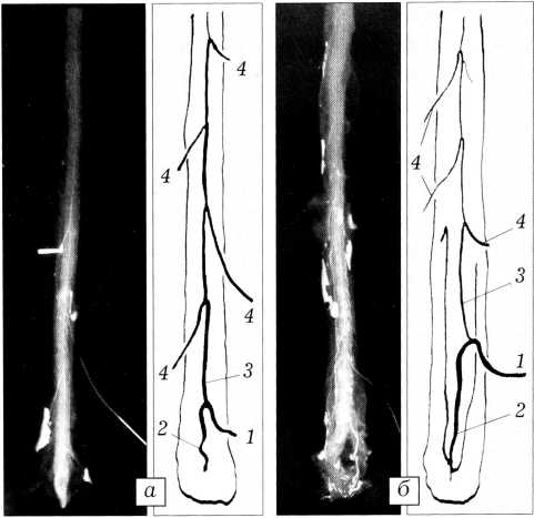 Рис. 2. Рассыпной тип кровоснабжения спинного мозга: а — с равномерным, б — с неравномерным расположением дополнительных радикуломедуллярных артерий. 4 — дополнительная радикуломедуллярная артерия (остальные обозначения те же, что на рис. 1).