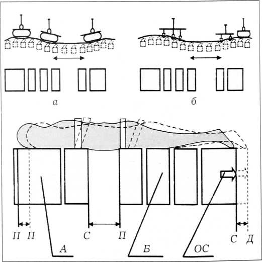 При выполнении процедуры вытяжения прикладываемое усилие вызывает напряжение фиксирующей системы тракционного устройства и упругих структур всей кинематической цепи позвоночника, приводя к неизбежным потерям длины вытяжения за счет нежелательных смещений проксимально и дистально фиксируемых отделов. Исходя из этого, мы учитывали следующие параметры измерений (см. рис. 1): ОС — общая сила в килограммах; СП — общая величина смещения тяговой площадки или блока Б относительно неподвижных площадок блока А в миллиметрах; ПП — величина проксимальных потерь (смещения тела относительно неподвижного блока А) в миллиметpax; СД — величина смещения дистально фиксируемого отдела в миллиметрах; ВД — общая величина дистракции в миллиметрах (разность СД-ПП); ПД — потери дистальные в миллиметрах (СП-СД); ОП — общие потери в миллиметрах (ПД+ПП).