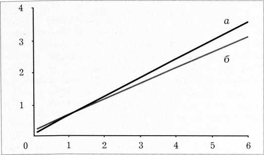 Рис. 2. Линейная модель регрессии коэффициентов интервала жесткости и дистракционности в начале (а) и в конце (б) лечения. По оси абсцисс — коэффициент интервала жесткости; по оси ординат — коэффициент дистракционности.