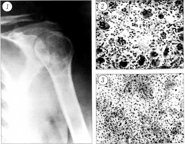При обследовании обращает на себя внимание атрофия мышц левого плеча. Рентгенологически в проксимальном отделе левой плечевой кости определяется резко выраженное истончение кортикального слоя, головка и шейка замещены патологической тканью литического характера. Заключение: гигантоклеточная опухоль (рис. 1). 15.02.96 произведена трепанобиопсия. Гистологическое заключение: гигантоклеточная опухоль кости.