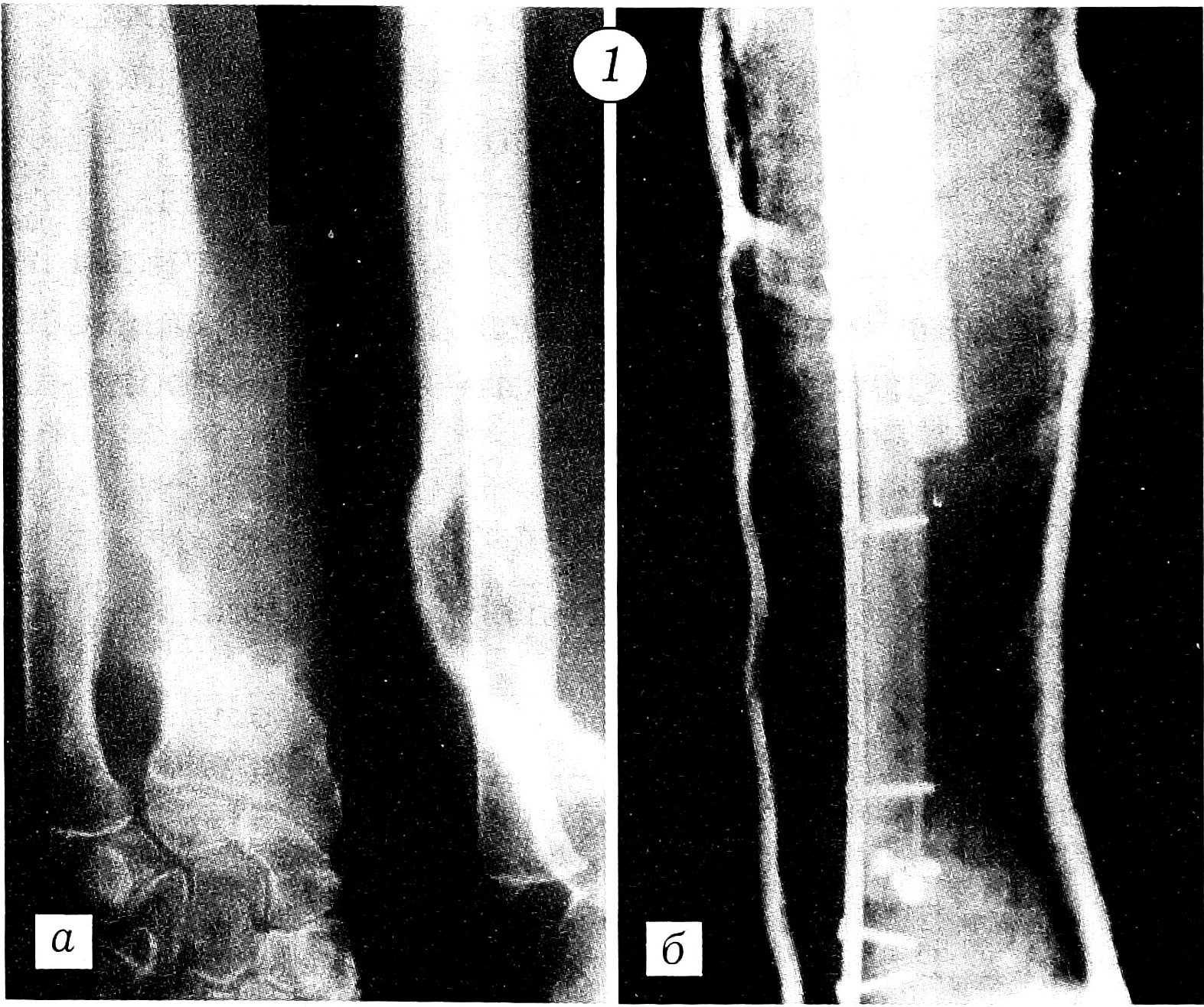 Рис. 1. Рентгенограммы правого предплечья больного с переломом лучевой кости в области метастаза рака нижней губы. а — до операции; б — после операции.