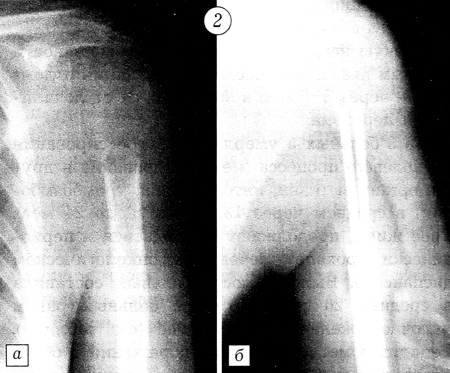 Рис. 2. Рентгенограммы левой плечевой кости больной с переломом головки и шейки плеча в области метастаза рака молочной железы. a — до операции; б — после эндопротезирования по Воронцову.