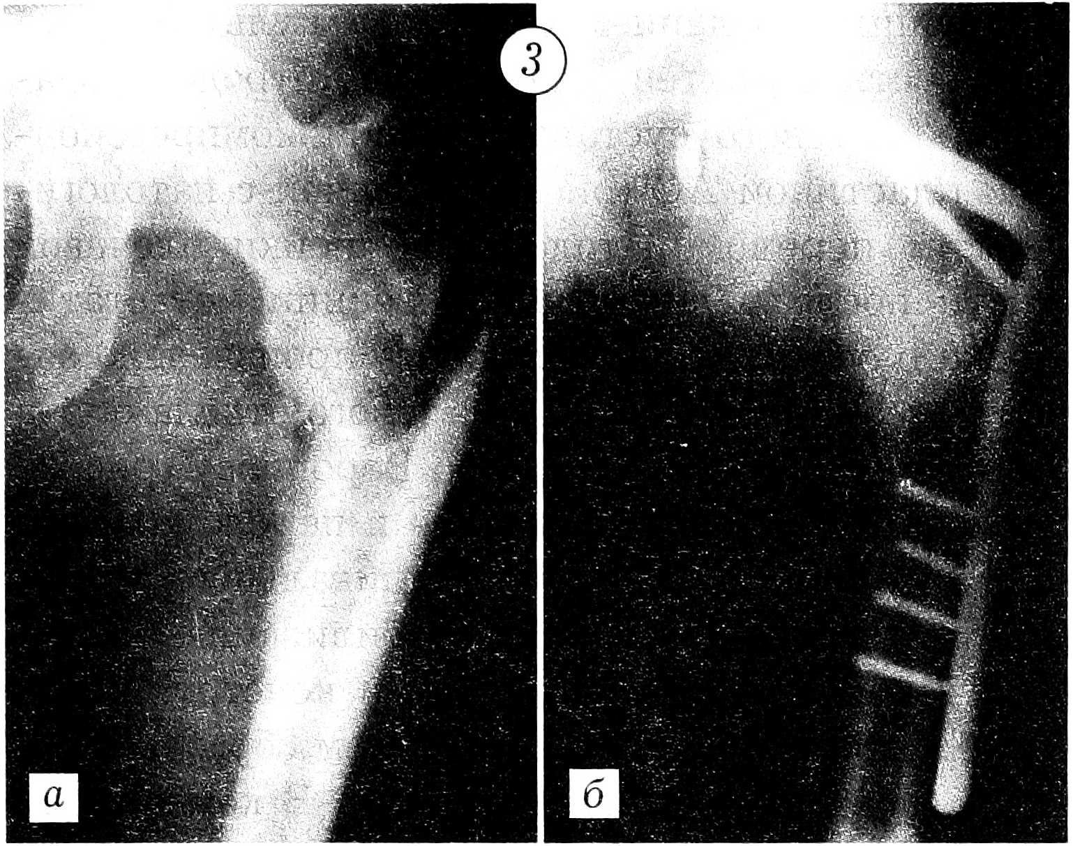 Рис. 3. Рентгенограммы левой бедренной кости больного с переломом диафиза бедра в области метастаза меланомы глаза. a — до операции; б — после остеосинтеза Г-образной пластиной.