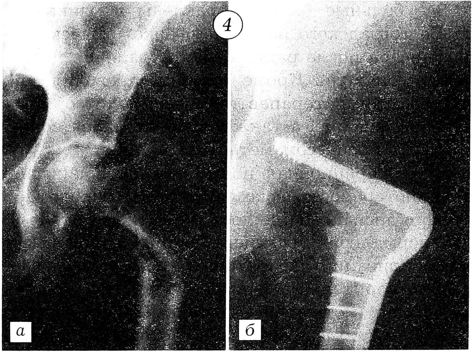 Рис. 4. Рентгенограммы левой бедренной кости больной с подвертельным переломом в области метастаза рака молочной железы. a — до операции; б — после остеосинтеза конструкцией DHS.
