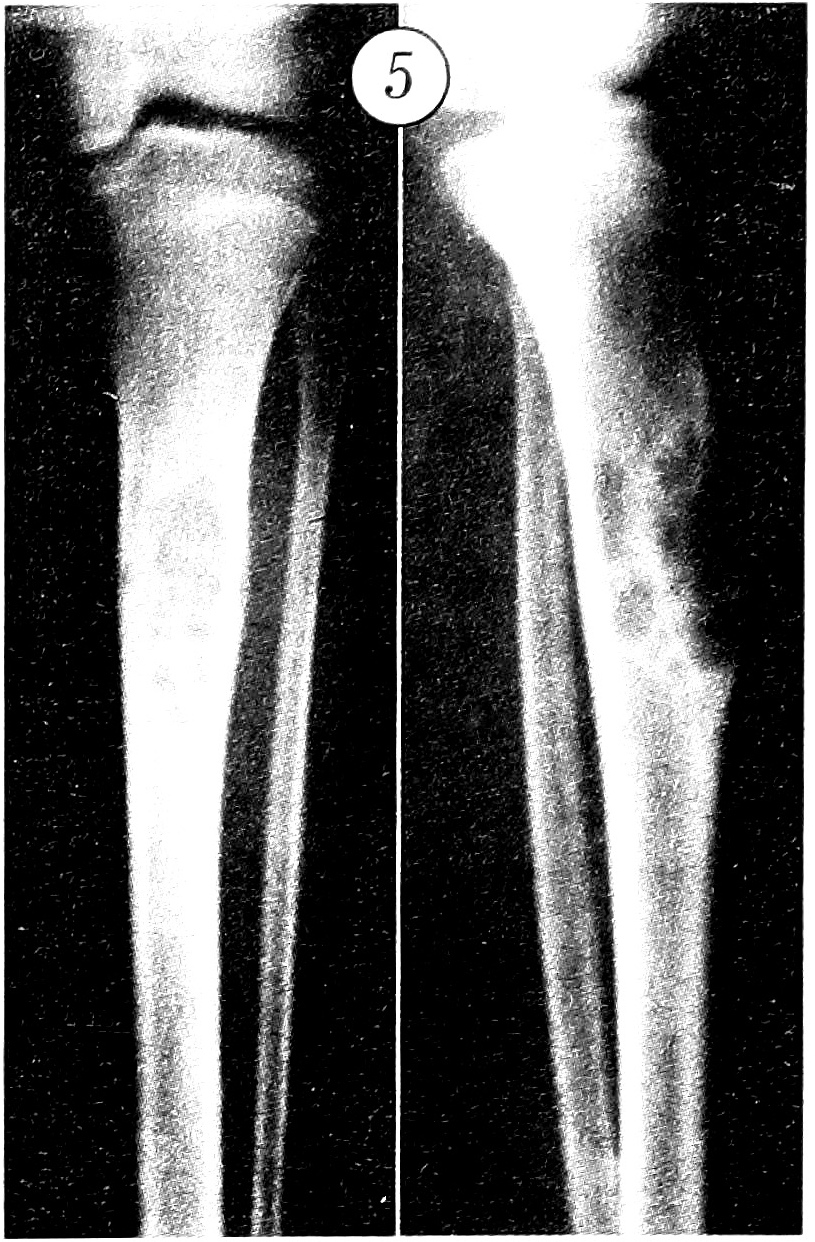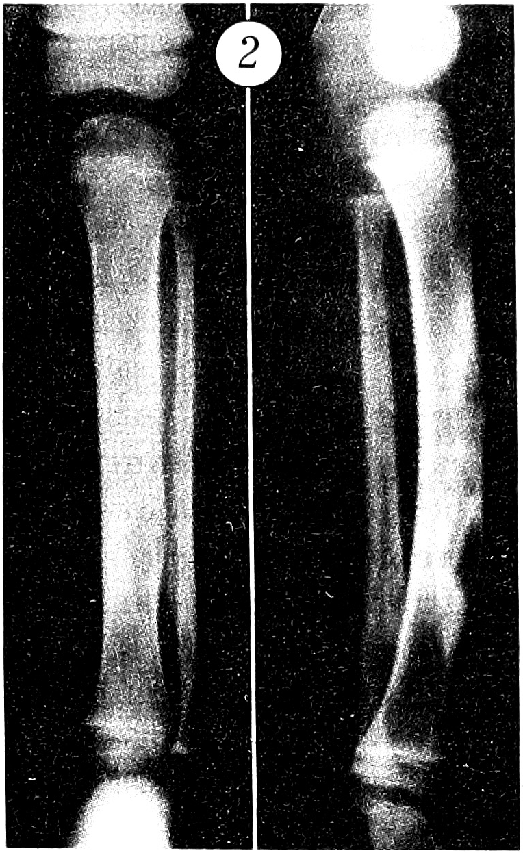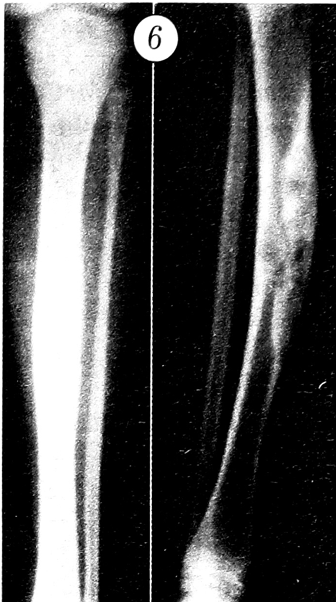 Для ОФД характерен монооссальный тип поражения с локализацией процесса в большой берцовой кости. Такая локализация отмечена у 22 наших больных, из них у 5 была поражена также малая берцовая кость. У 1 больного процесс локализовался в локтевой и у 1 — в бедренной кости.