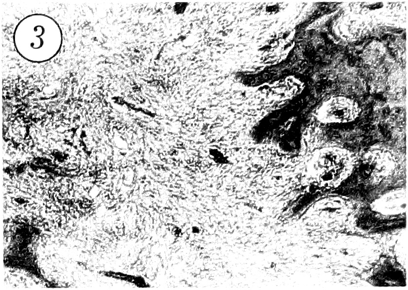 Рис. 3. В патологическом очаге кортикальная кость замещена фиброзной тканью с отдельными костными трабекулами. Окраска гематоксилином и эозином. Ув. 100.