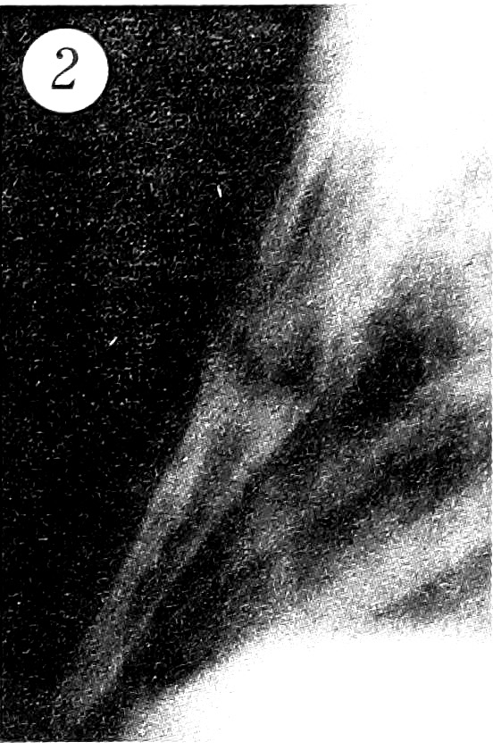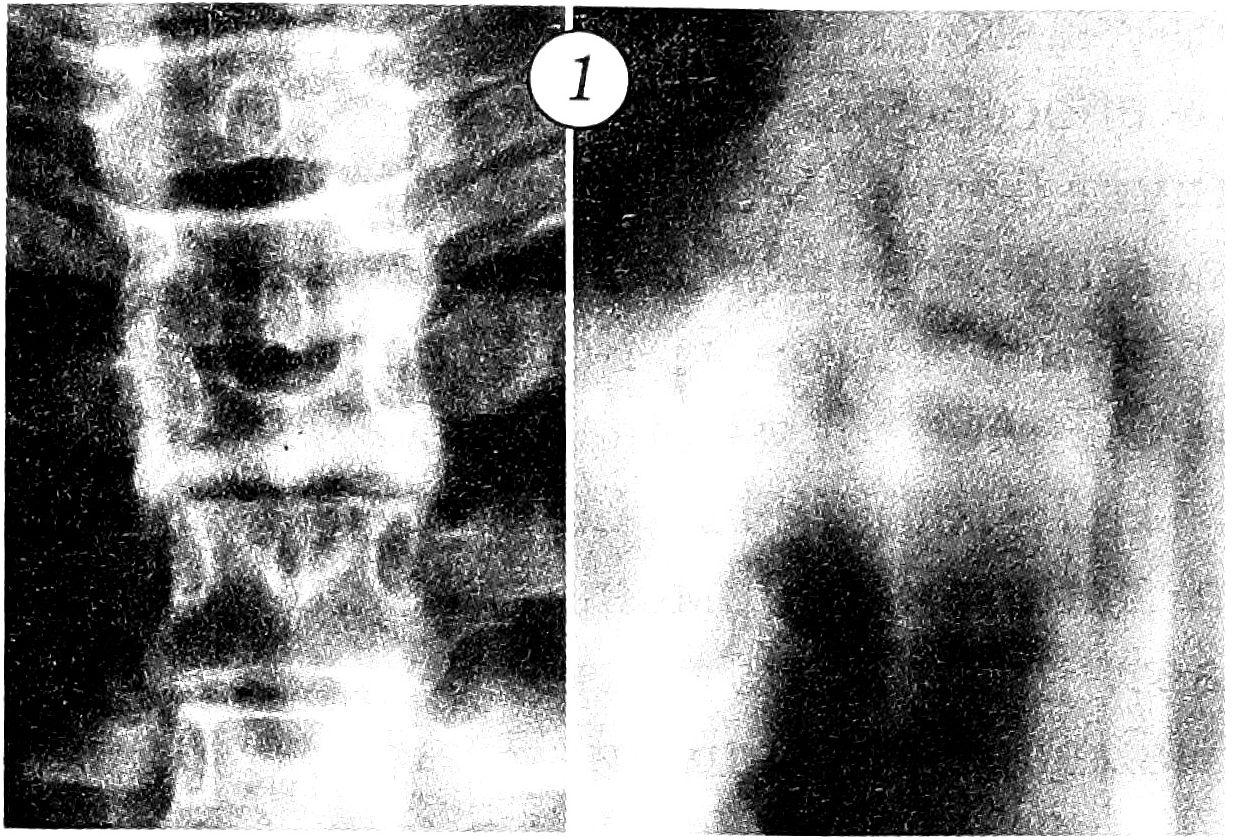 Госпитализирована в марте 1990 г. Диагноз вызывал сомнения, так как отмечались сильные боли и выраженная анталгическая поза. Проведены рентгенологическое и радионуклидное исследования. Выявлены изменения в теле ТЗ позвонка (рис. 1) и грудине (рис. 2). В правой ключице отмечено повышенное накопление радиофармпрепарата, однако на рентгенограммах очаг выявить не удалось. Содержание лейкоцитов в периферической крови 8,8 • 109/л, СОЭ 41 мм/ч. Диагностирован ХРМО с поражением ТЗ позвонка, грудины, правой ключицы. Назначен курс пенициллина, улучшения не отмечалось. Проведено лечение преднизолоном по 40 мг в сутки в течение 3 нед. Боли прекратились на 2-й день, СОЭ постепенно снизилась до 33 мм/ч. Изготовлен корсет с головодержателем. Больная выписана домой.