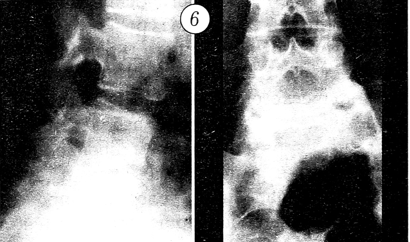 Обострений не отмечалось до октября 1992 г., когда вновь появились несильные боли в спине, тазу, обеих нижних конечностях, анталгическая поза. Проведено лечение, направленное на профилактику остеопороза. Боли не беспокоили до конца лета 1994 г., осенью появлялись периодически. Зимой, после переохлаждения, боли усилились, вновь развилась анталгическая поза. В феврале 1995 г. больная госпитализирована, выявлены изменения в Т7-8, L5 и S1 позвонках (рис. 5 и 6). СОЭ составляла 37 мм/ч. Назначен курс лечения вольтареном в свечах, изготовлен корсет. До настоящего времени обострений больше не было.