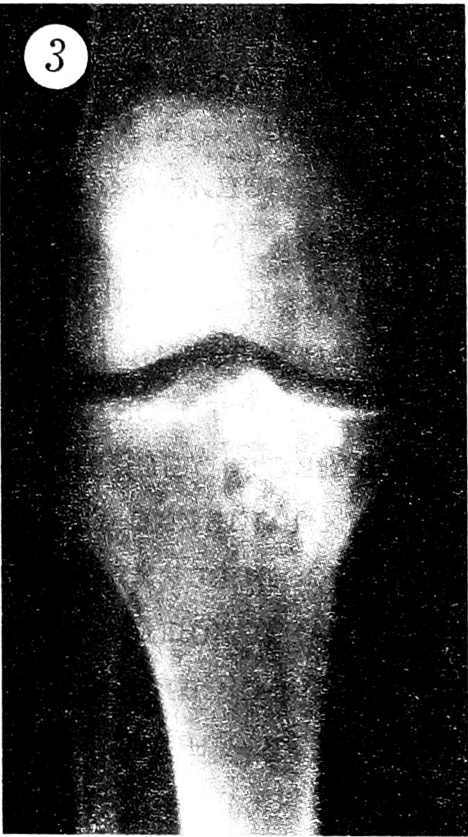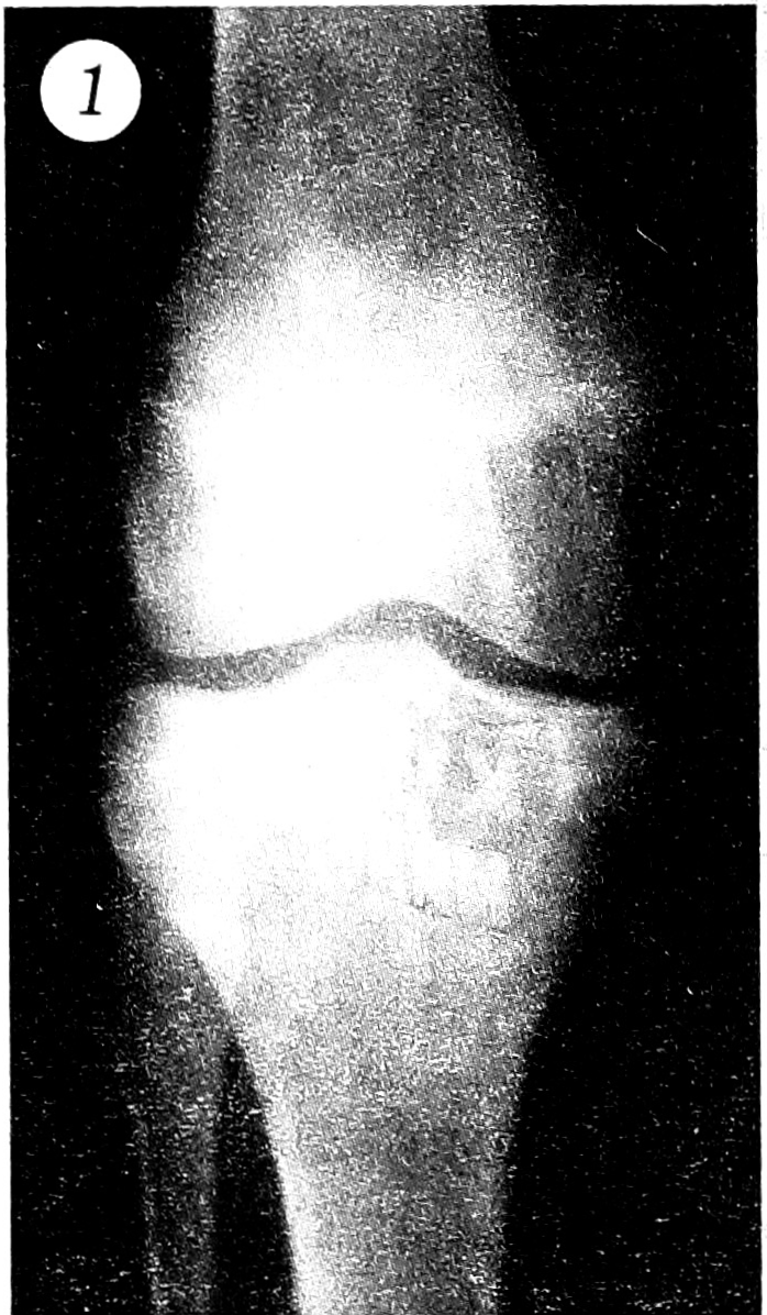 При поступлении: выраженная хромота на правую ногу, гипотрофия в нижней трети бедра, коленный сустав увеличен в объеме за счет периартикулярных тканей по внутренней поверхности. Резкая болезненность при пальпации внутреннего мыщелка большеберцовой кости. Активные движения в коленном суставе практически в полном объеме. Кожные покровы не изменены. В клинических и биохимических анализах крови и мочи отклонений от нормы нет. На рентгенограмме правого коленного сустава в метаэпифизе большеберцовой кости определяется очаг деструкции округлой формы диаметром 2,5 см с ободком склероза. Имеется вздутие кости на этом уровне, периостальная реакция. Создается впечатление прерывания коркового слоя на уровне очага деструкции (рис. 1). Клинико-рентгенологическая дифференциальная диагностика проводилась между хондробластомой, хондромой с озлокачествлением, абсцессом Броди. 10.08.93 произведена пункционная биопсия, гистологическое заключение: хондросаркома.