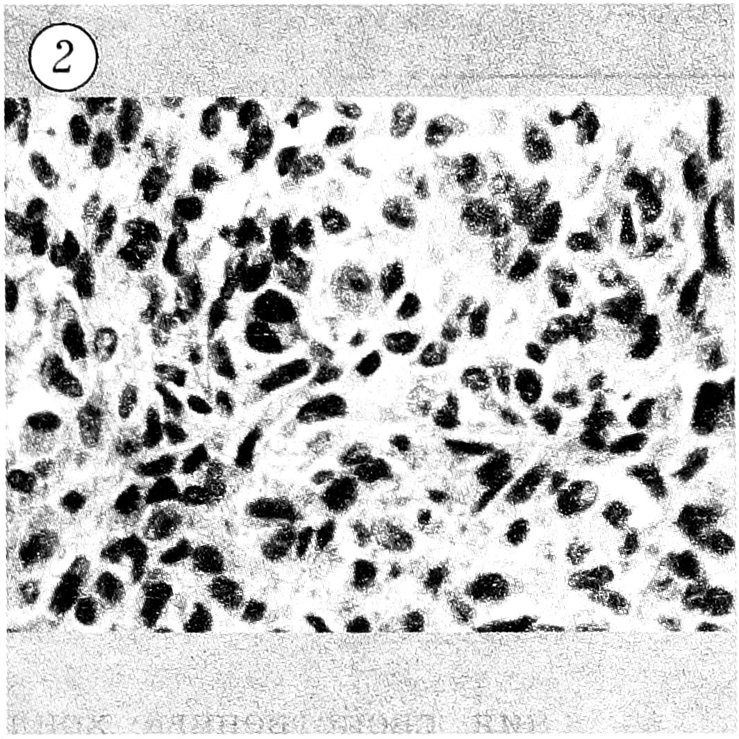 18.08.93 больной оперирован — выполнены околосуставная резекция верхней трети большеберцовой кости вместе с опухолью и прилежащими мягкими тканями единым блоком, электрокоагуляция, замещение образовавшегося дефекта аутотрансплантатом из крыла подвздошной кости. Послеоперационный период протекал без осложнений. При гистологическом исследовании операционного материала обнаружено строение злокачественной хондробластомы. Готовые гистологические препараты консультированы в патологоанатомической лаборатории ЦИТО, диагноз злокачественной хондробластомы подтвержден (рис. 2).