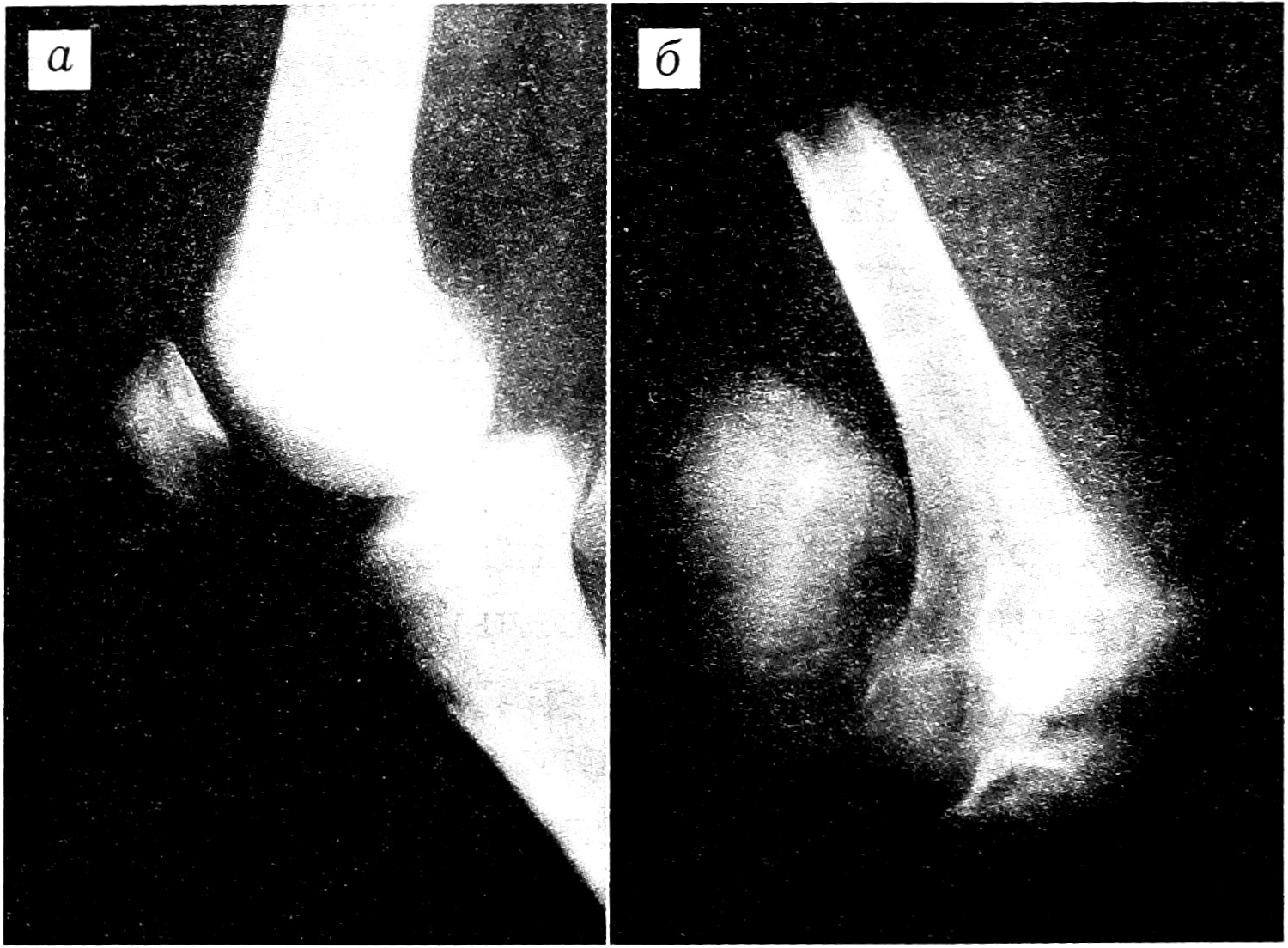 Рис. 1. Больной И.: рентгенограмма левого бедра до операции (а) и рентгенограмма препарата (б).