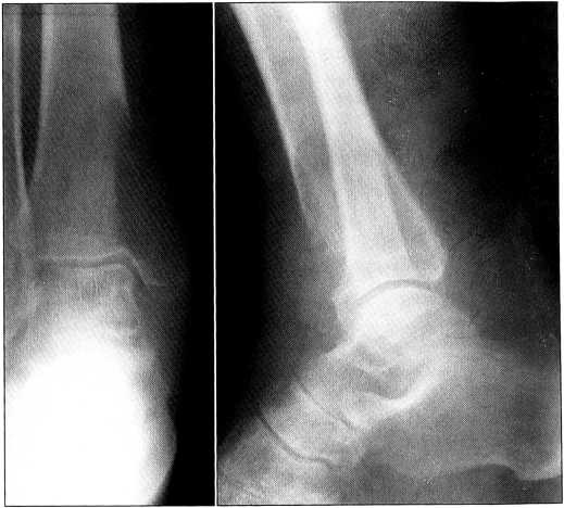 Больной С-в,45 лет, госпитализирован в больницу № 62 21.02.00 с диагнозом: опухоль дистального отдела правой большеберцовой кости. За 10 мес до поступления по внутренней поверхности правого голеностопного сустава появилась припухлость, которая постепенно увеличивалась. Через 3,5 мес присоединились боли. Амбулаторно проводилась физиотерапия.