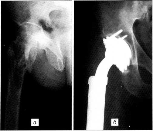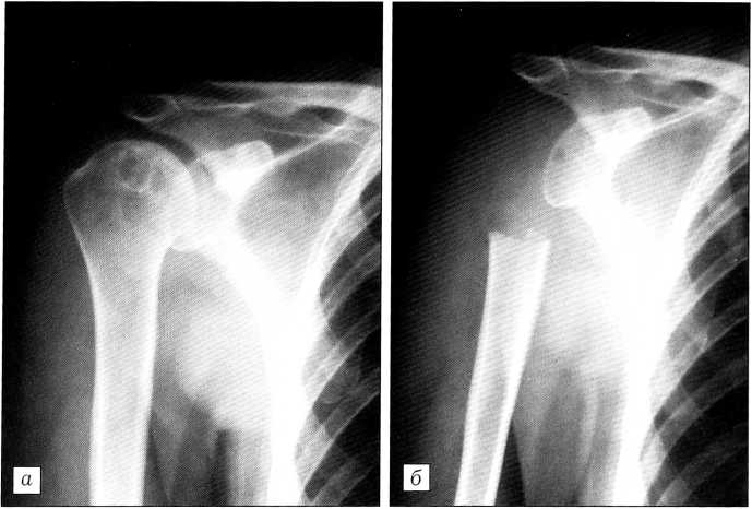 Рис. 2. Рентгенограммы больной П. до (а) и после (б) операции.