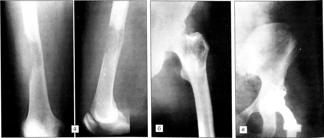 Рис. 4. Рентгенограммы больного К. а — правое бедро до операции; б — левое бедро до, в — после операции.