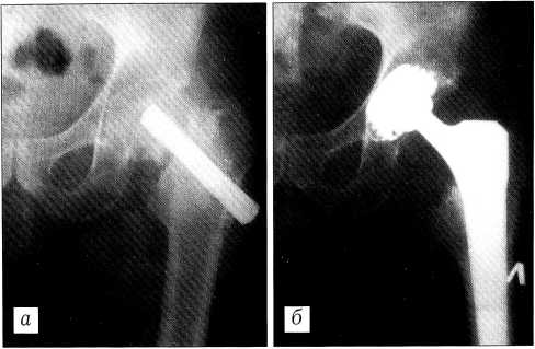 Рис. 5. Рентгенограммы больного с ложным суставом шейки бедра: а — до, б — после эндопротезирования.