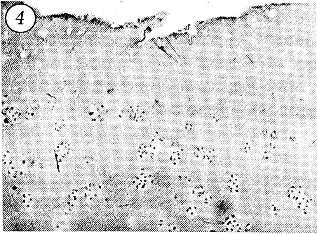 Обсуждение. Гистологическое исследование тканей тазобедренных суставов показало, что сущность поражения суставного хряща при хондролизе неоднородна, а исход в случае необратимого процесса относительно стереотипен. Поскольку объектом исследования были сравнительно небольшие фрагменты суставной поверхности, не всегда репрезентировавшие участки максимального поражения хряща, об исходах процесса можно судить лишь предположительно. Распределение случаев по давности клинических проявлений заболевания (8, 18, 24 мес) позволяет в известной мере оценить динамику некоторых элементов поражения тканей сустава при хондролизе.