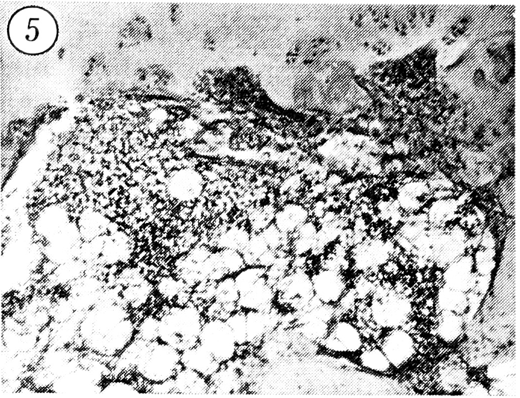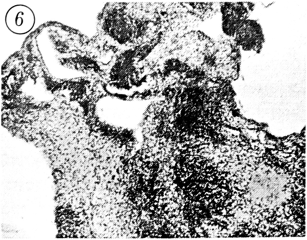 Патологические изменения в субхондральной костной пластинке обычно выражены сильнее, чем в глубоких отделах спонгиозы головки. В большинстве случаев отмечается довольно значительное общее истончение субхондральной пластинки, кое-где переходящее в ее прерывистость, наличие полостей остеопластической резорбции, общих для обызвествленного хряща глубокой зоны и субхондральной пластинки. Резорбционные полости содержат рыхлый волокнистый костный мозг с незначительной мононуклеарной инфильтрацией либо очагами серозного воспаления. В направлении более глубокой спонгиозы головки волокнистый костный мозг постепенно переходит в желтый. Лишь в одном случае отмечено утолщение субхондральной пластинки, связанное с очагами энхондрального окостенения глубокой зоны хряща. В содержащейся в биоптатах спонгиозе глубоких отделов головки наблюдается различной выраженности остеопороз; встречаются очаги фиброзирования желтого костного мозга, а в костных перекладинах — мелкие участки с бесклеточными костными лакунами.