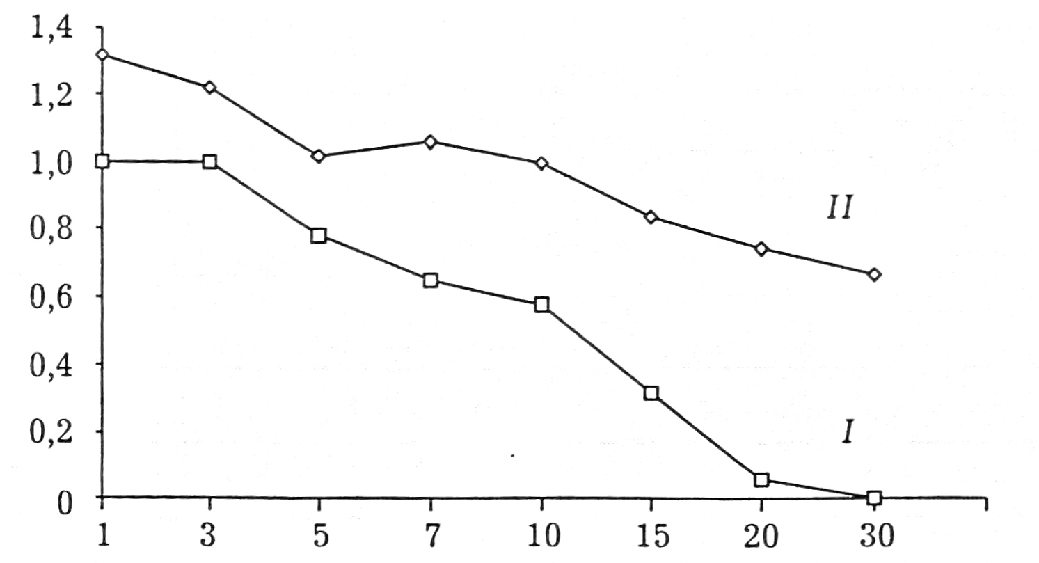 Во 2-ю группу вошли 14 больных с затяжным, иногда волнообразным послеоперационным течением, сопровождавшимся длительным накоплением экссудата в области эндопротеза. У некоторых пациентов имелись осложнения (тромбофлебит, обострение холецистита, нагноение в области операции), а также гематологические отклонения (анизоцитоз, появление плазматических клеток, длительно не купирующаяся постгеморрагическая анемия). В этой группе индекс тяжести послеоперационного течения был выше 0,7 даже к 30-м суткам (рис. 1).