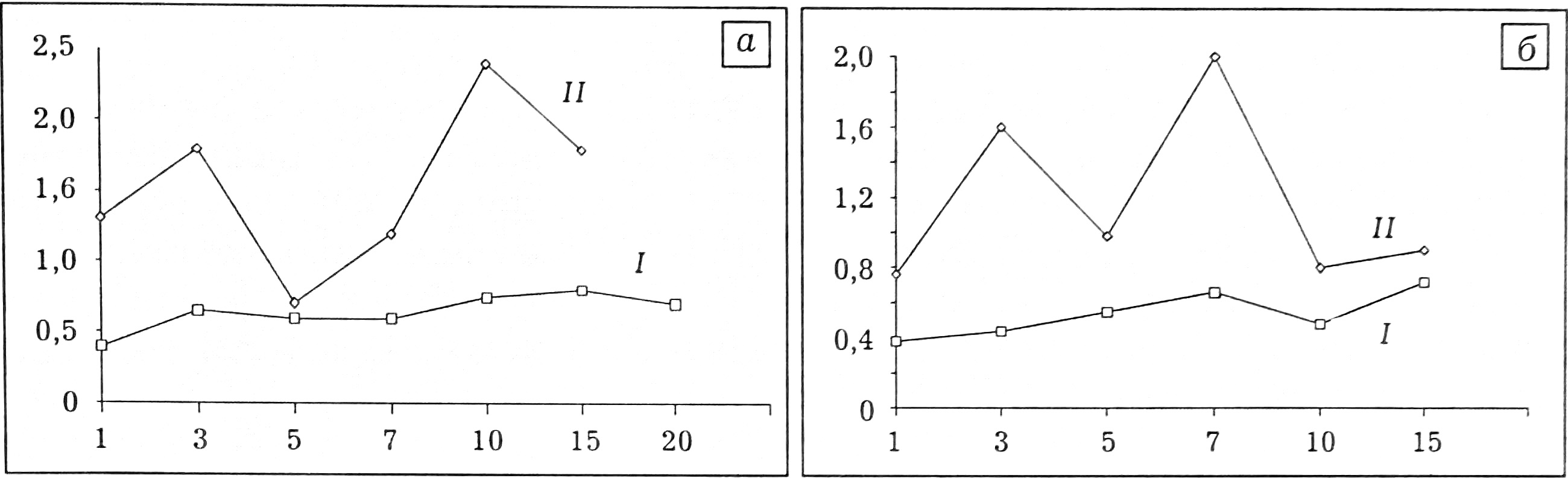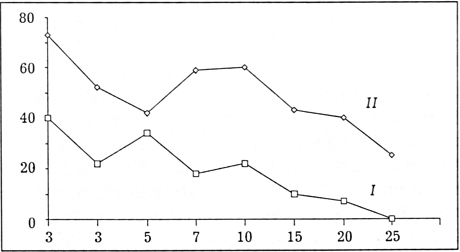 Здесь и на рис. 2 и 3: I — больные с благоприятным, II — с затяжным течением.