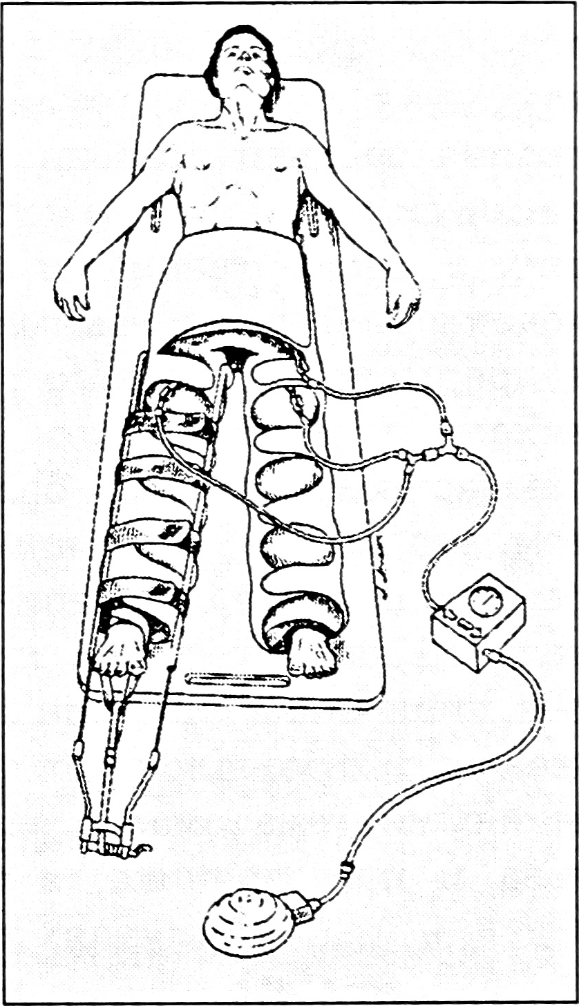 В этом плане обнадеживающие результаты получены при применении противошокового костюма (ПШК) «Каштан» (см. рисунок), который обеспечивает временную остановку внутрибрюшного кровотечения, кровотечений в зоне переломов таза, бедра, голени, а также перераспределение 1,5-2 л крови из депо нижней половины туловища и конечностей в центральный объем крови. Положительный гемодинамический эффект (повышение артериального давления) отмечен во всех случаях использования ПШК «Каштан» у тяжелопострадавших с сочетанной травмой. У 93,4% пациентов повышение артериального давления носило стойкий характер (не менее нескольких часов). Применение ПШК «Каштан» в остром периоде травмы позволило сохранить жизнь 47% тяжелопострадавших, а остальным продлить ее на срок от 2 до 25 сут.