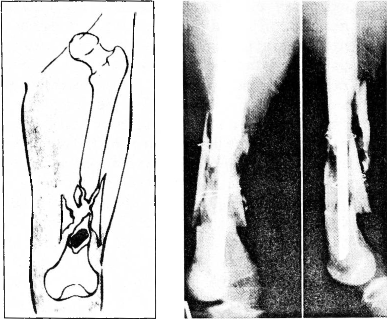 Рис. 1. Огнестрельный перелом левой бедренной кости в нижней трети (схема).
