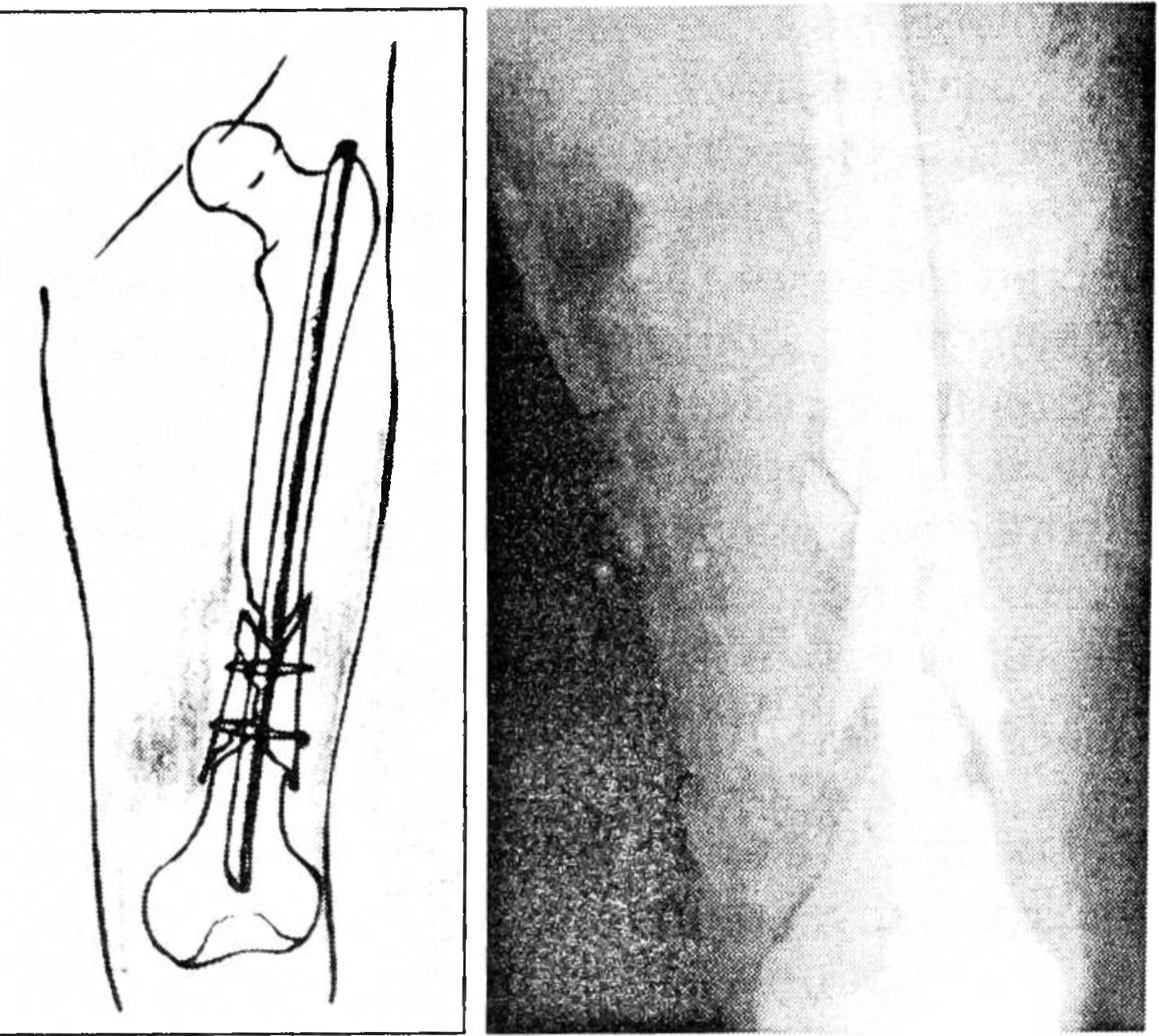 Рис. 2. Состояние после ПХО, интрамедуллярного остеосинтеза и фиксации осколков проволочным серкляжем.