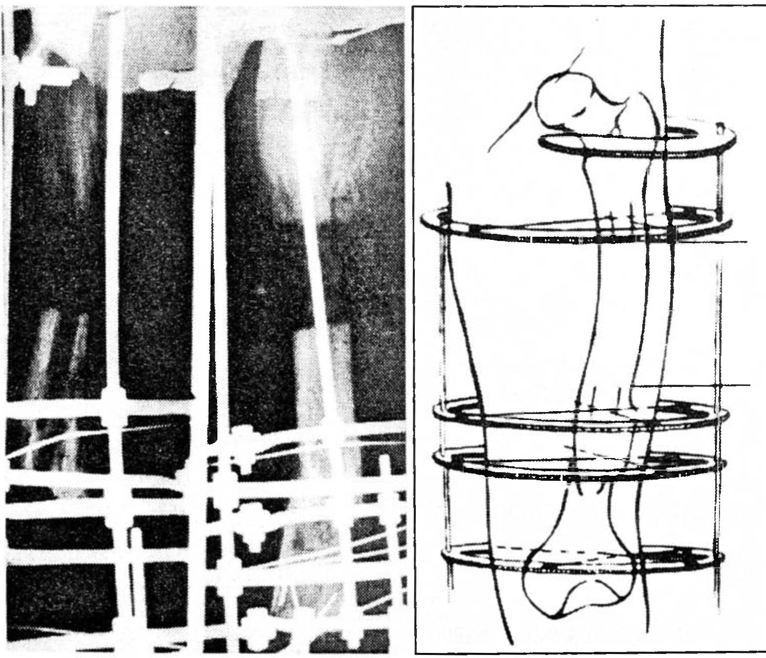 Рис. 3. Состояние после резекции остеомиелитического очага, наложения компрессионно-дистракционного аппарата; формирующийся регенерат в зоне дефекта кости.