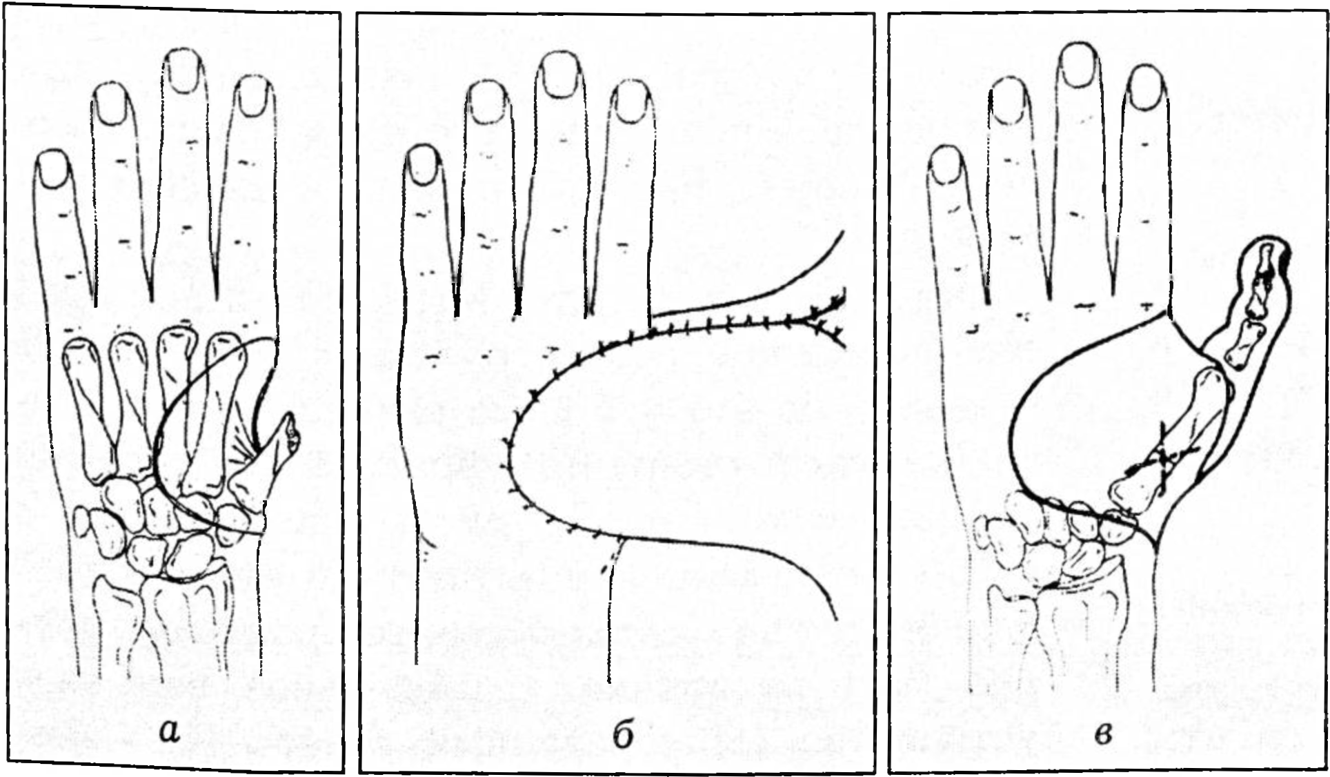 Через 4—5 нед после пластики сдвоенным лоскутом осуществляют пересадку II пальца стопы на культю I пястной кости. Сдвоенный лоскут отсекают от живота, освежают торец культи I пястной кости и выделяют реципиентные сосуды и нерв. Далее переносят II палец стопы на лучевой край кисти и производят остеосинтез костных фрагментов с последующим восстановлением кровообращения в пальце. Выполняют шов нервов пальца и сухожилий. Дефекты мягких тканей вокруг плюсневой кости закрывают, используя основания сдвоенного лоскута (рис. 1, в). Для этого лоскуты разделяют по рубцу и одним из них замещают дефект кожи по ладонно-лучевой, другим — по ладонно-локтевой поверхности плюсневой кости.