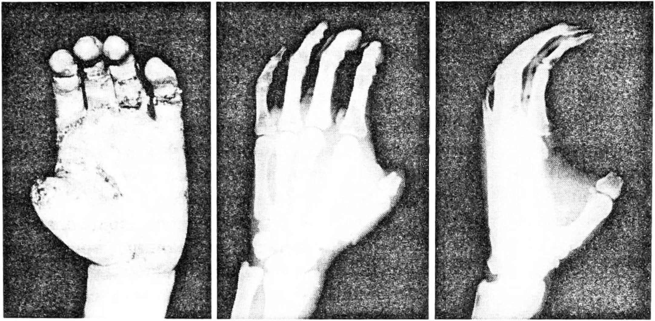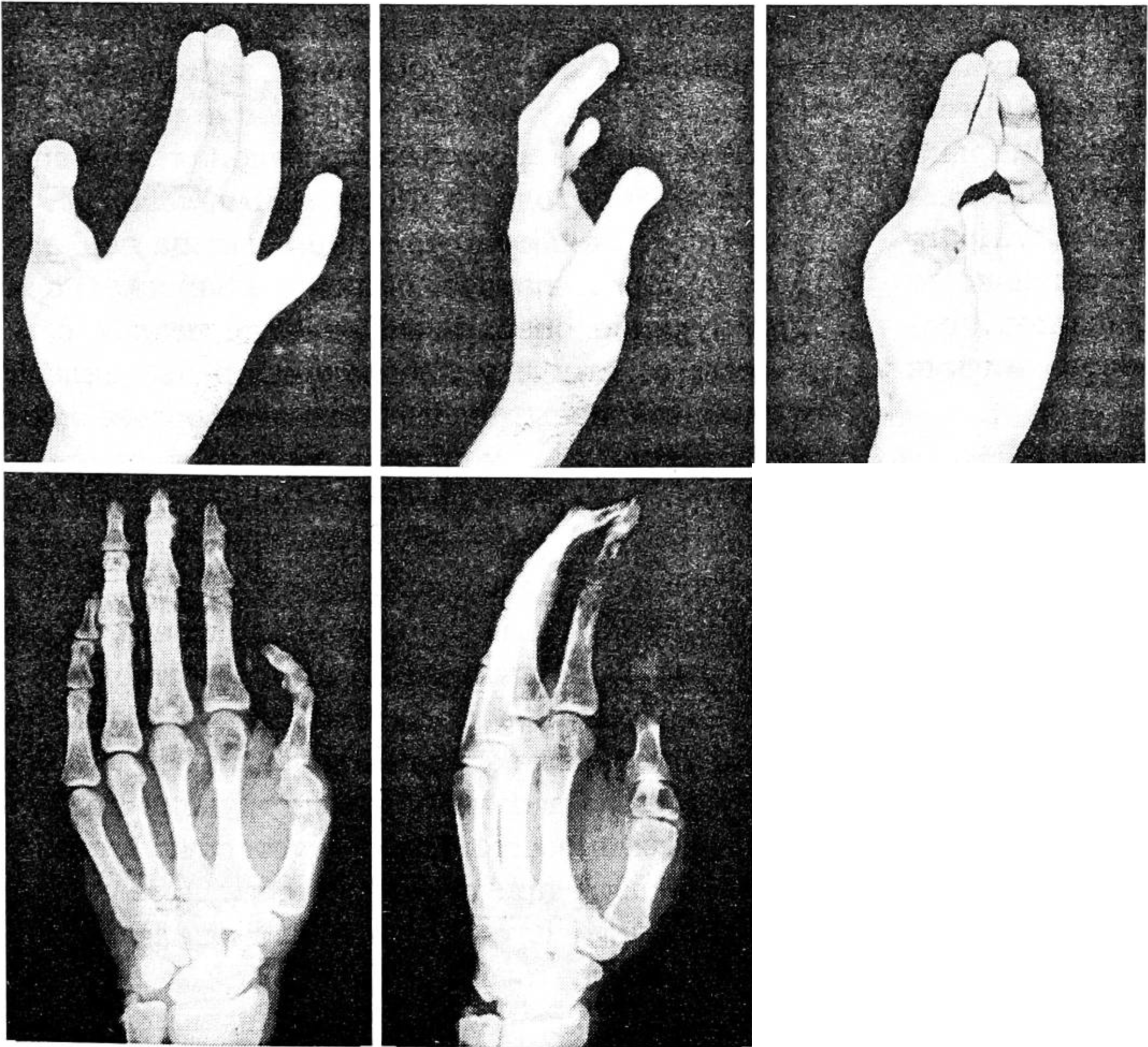 Рис. 3. Тот же больной: внешний вид, рентгенограммы кисти и функциональный результат через 1 год после операции.