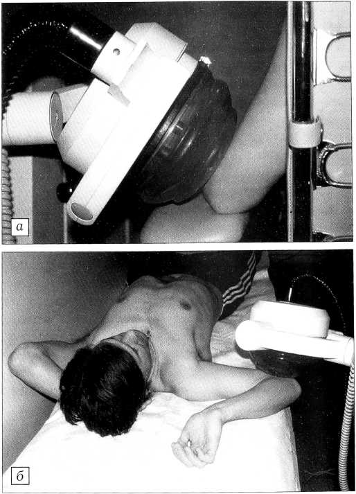 Процедура проводится в положении больного сидя с фиксацией руки в специальной подставке или в положении лежа. Возможны два вида позиционирования терапевтической головки прибора — тангенциальное и прямое.
