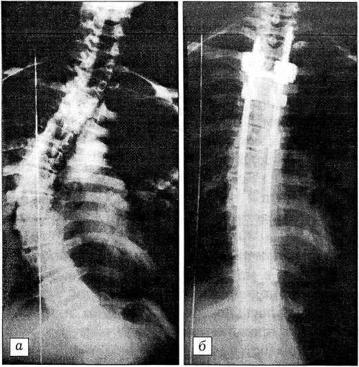 Рис. 1. Больная Л. 16 лет. а — до операции: правосторонняя грудная деформация 64°; б — после операции: величина дуги 25° (через 6 мес потери коррекции нет).