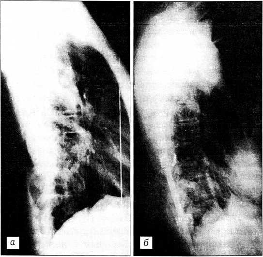 Рис. 2. Та же больная. а — до операции: грудной лордоз 11°; б — после операции: сформирован грудной кифоз 14° (через 6 мес — 15°).