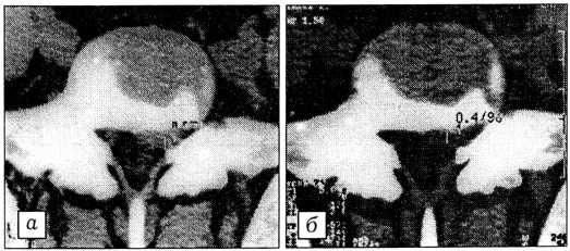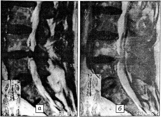 Рис. 2. Магнитно-резонансная томограмма поясничного отдела позвоночника: а — до операции (протрузия L4-5 диска 8 мм); б — через 1 мес после операции (протрузия диска 6 мм).