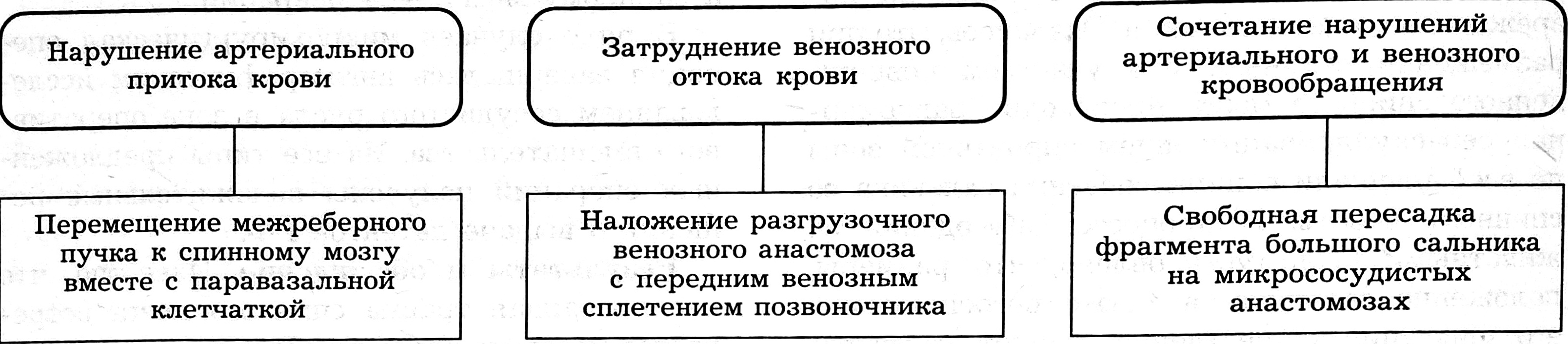При травме спинного мозга встречаются в основном три варианта сосудистых нарушений в очаге поражения: частичная или полная ишемия тканевых структур вследствие повреждения корешковых и спинальных артерий, нарушение венозного оттока крови из-за повреждения переднего венозного сплетения позвоночника и сочетание нарушений артериального и венозного кровообращения. Совершенно очевидно, что характер коррекции циркуляторных расстройств с помощью микрососудистых операций в каждом конкретном случае должен определяться особенностями складывающейся сосудистой ситуации. С учетом этого нами разработаны три типа микрососудистых операций для коррекции различных видов сосудистых нарушений, наблюдающихся у больных с травмой спинного мозга (см. схему).