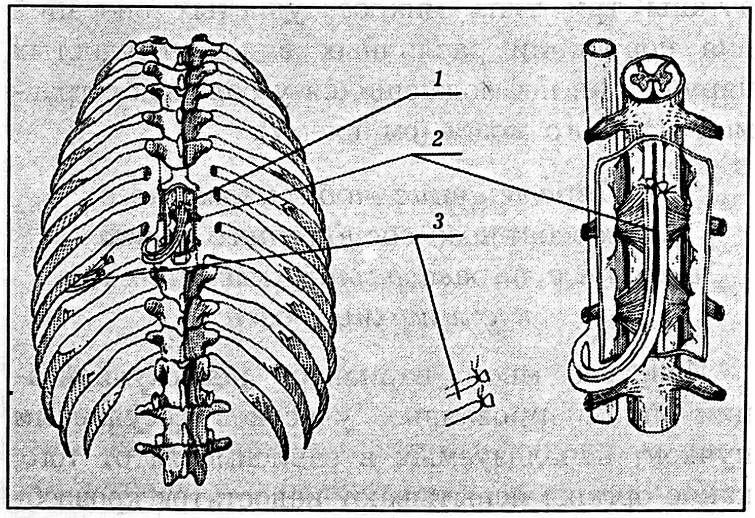 1 — зона контузии спинного мозга; 2 — сосудистый пучок, подведенный к зоне контузии; 3 — перевязанные межреберные сосуды.