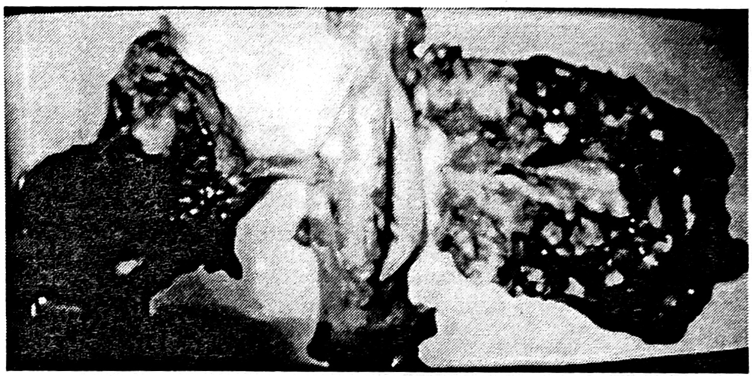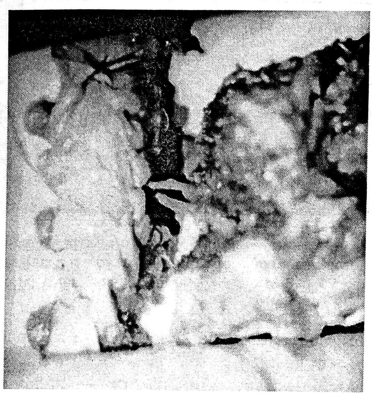 Проходимость анастомозов и величину кровоснабжаемого участка определяли путем контрастирования сосудов 76% раствором верографина. Во всех 4 наблюдениях установлена проходимость анастомозов и наполняемость сосудов сальника по всей поверхности вокруг сегмента спинного мозга (рис. 5).