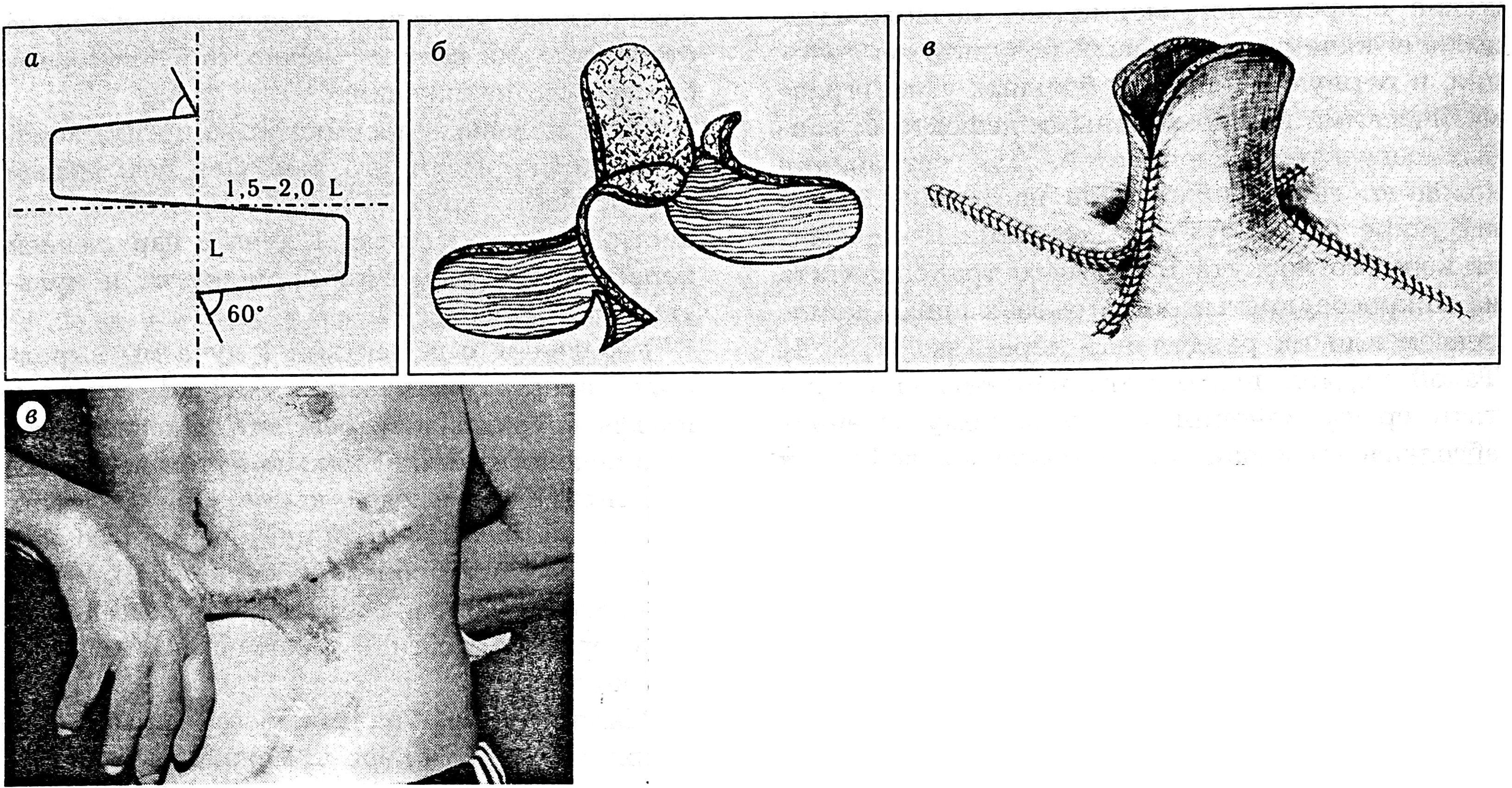 а — схема выполнения кожных разрезов при формировании сдвоенного кожно-жирового лоскута; б — кожно-жировые языкообразные лоскуты мобилизованы; в — треугольные лоскуты подведены к основанию сдвоенного лоскута; г — кисть больного подшита к животу с помощью сдвоенного лоскута.
