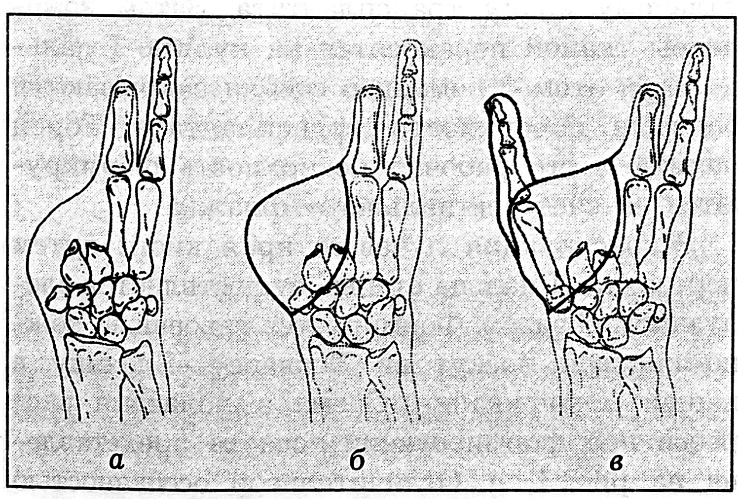 а — тотальный дефект лучевого края кисти, сочетающийся с дефицитом трехфаланговых пальцев и их культей; б — создан запас мягких тканей в области лучевого края кисти; в — устранен тотальный дефект лучевого края кисти и восстановлен первый межпальцевый промежуток.
