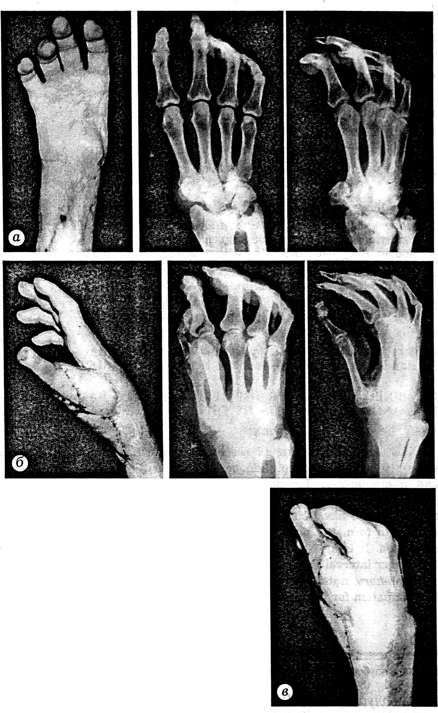 а — внешний вид и рентгенограммы кисти до операции; б — внешний вид и рентгенограммы кисти, в — функциональный результат через 1 год после операции.