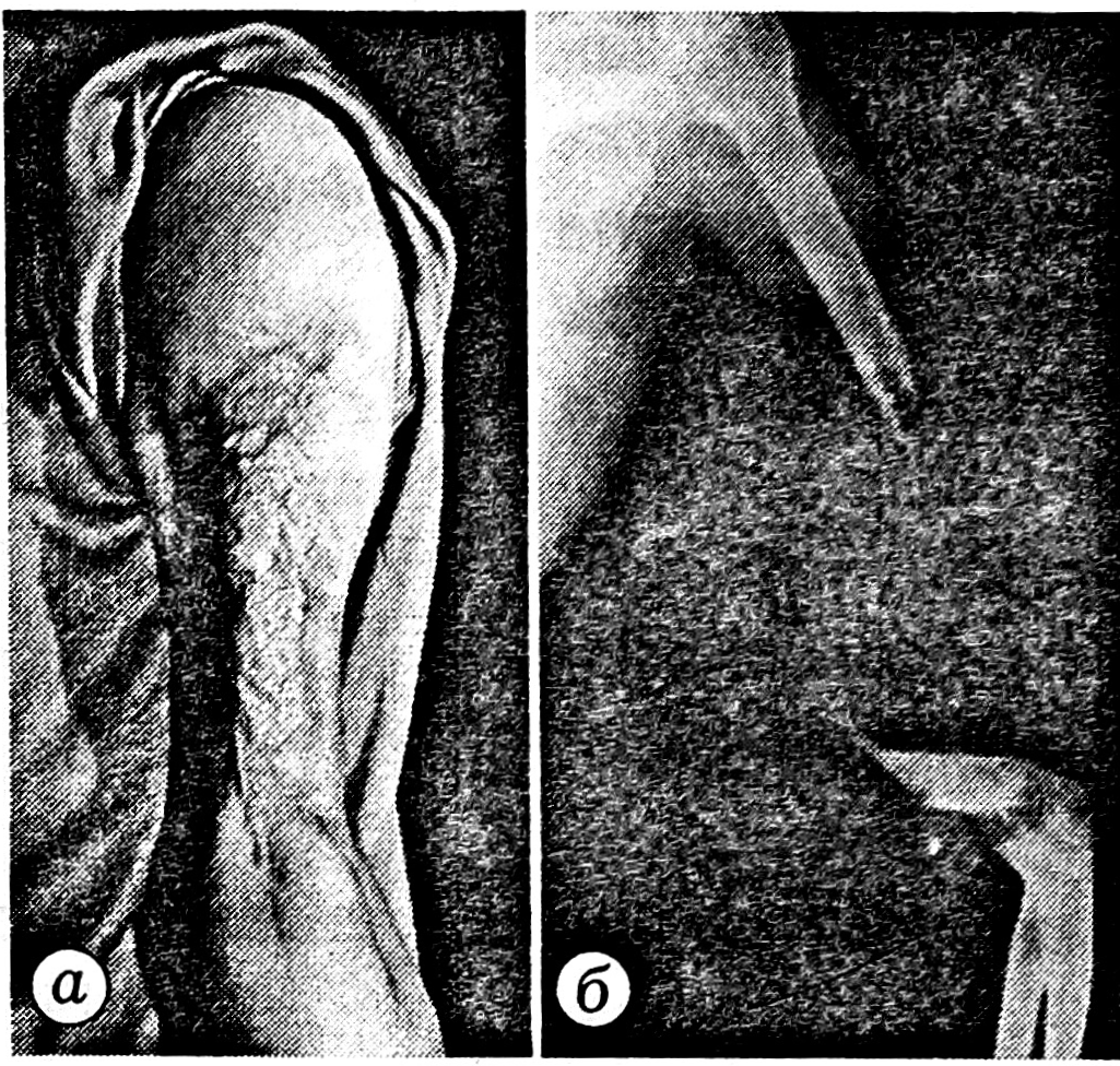Рис. 3. Спланирован торакодорсальный лоскут для транспозиции на переднюю поверхность плеча (а), широчайшая мышца спины перемещена на плечо, восполнен дефект кожного покрова (б).