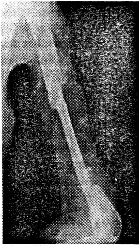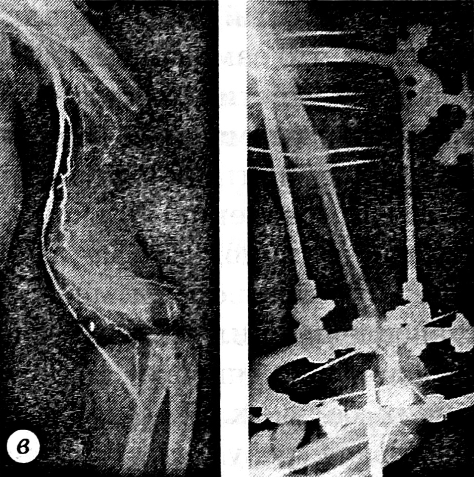 28.04.87 больной произведена аутопластика дефекта левой плечевой кости свободным васкуляризованным аутотрансплантатом из правой малоберцовой кости с одновременной транспозицией широчайшей мышцы спины на переднюю поверхность плеча с целью воссоздания кожного покрова и восстановления активного сгибания в локтевом суставе. Сосуды костного трансплантата анастомозированы с плечевой артерией конец в бок, трансплантат внедрен интрамедуллярно в концы реципиентной кости, произведен остеосинтез аппаратом Илизарова (рис. 2 и 3).