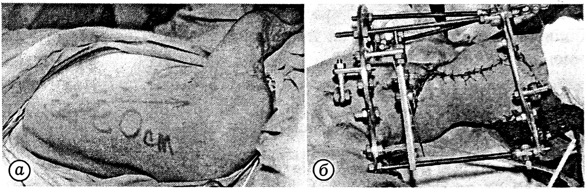 Перед основным этапом (костной пластикой васкуляризованным трансплантатом) осуществляли коррекцию деформации или укорочения сегмента конечности в аппарате Илизарова, который в дальнейшем использовали для фиксации трансплантата в зоне пораженного сегмента. Снимали аппарат после полной консолидации трансплантата с концами реципиентной кости, накладывая гипсовую повязку или тутор из поливика.