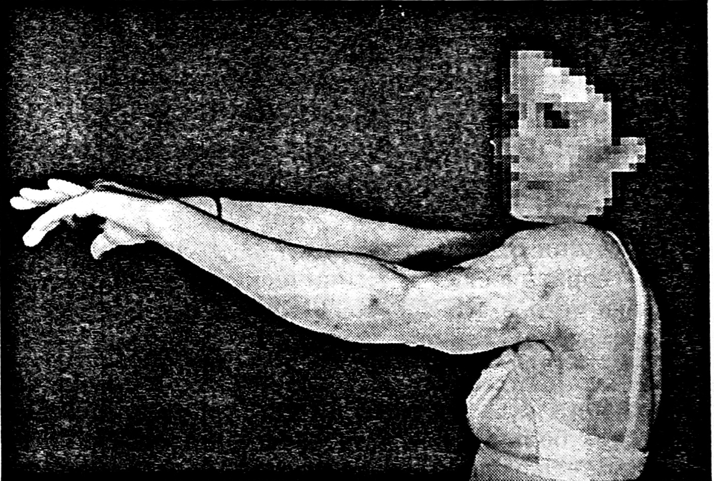 Через 3 мес наступила полная консолидация трансплантата с реципиентной костью (рис. 4). В процессе лечения проводилась электростимуляция перемещенной широчайшей мышцы спины. Функция ее сохранилась, движения в локтевом суставе восстановились (рис. 5).