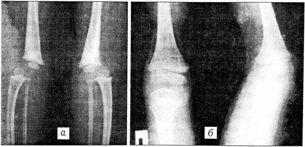 Рис. 3. Рентгенограммы больного с синдромом Ларсен. а — передние вывихи обеих голеней; б — нормальные соотношения в коленных суставах через 16 мес после открытого вправления вывихов голеней.
