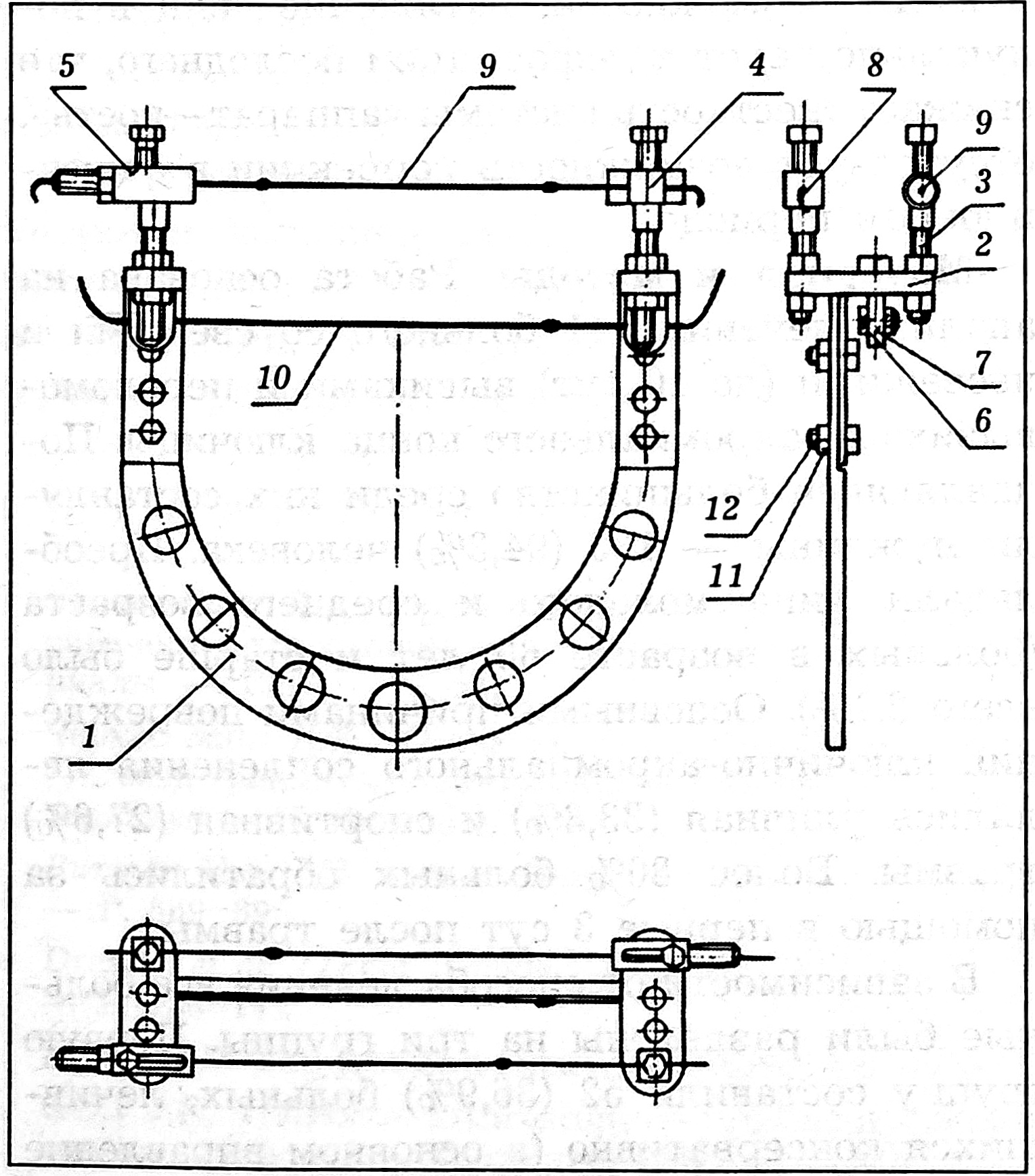 Данное устройство (рис. 1) содержит оригинальную скобу (1), на браншах которой посредством болтов (12) и гаек (11) закреплено основание (2); на основании расположены стойки с резьбой (3), свободные концы которых представляют собой спицефиксаторы (4, 5).
